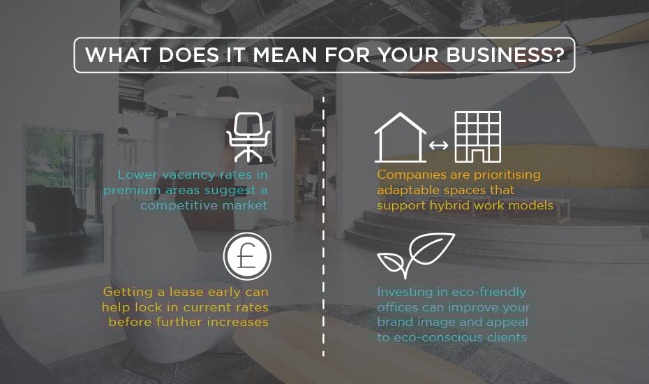 These trends are pushing the demand for high-quality offices. Companies are ready to pay more for spaces that offer the best features and experiences for their employees. Let’s take a closer look at the current situation of the commercial office space market in the UK for Q3 2024.